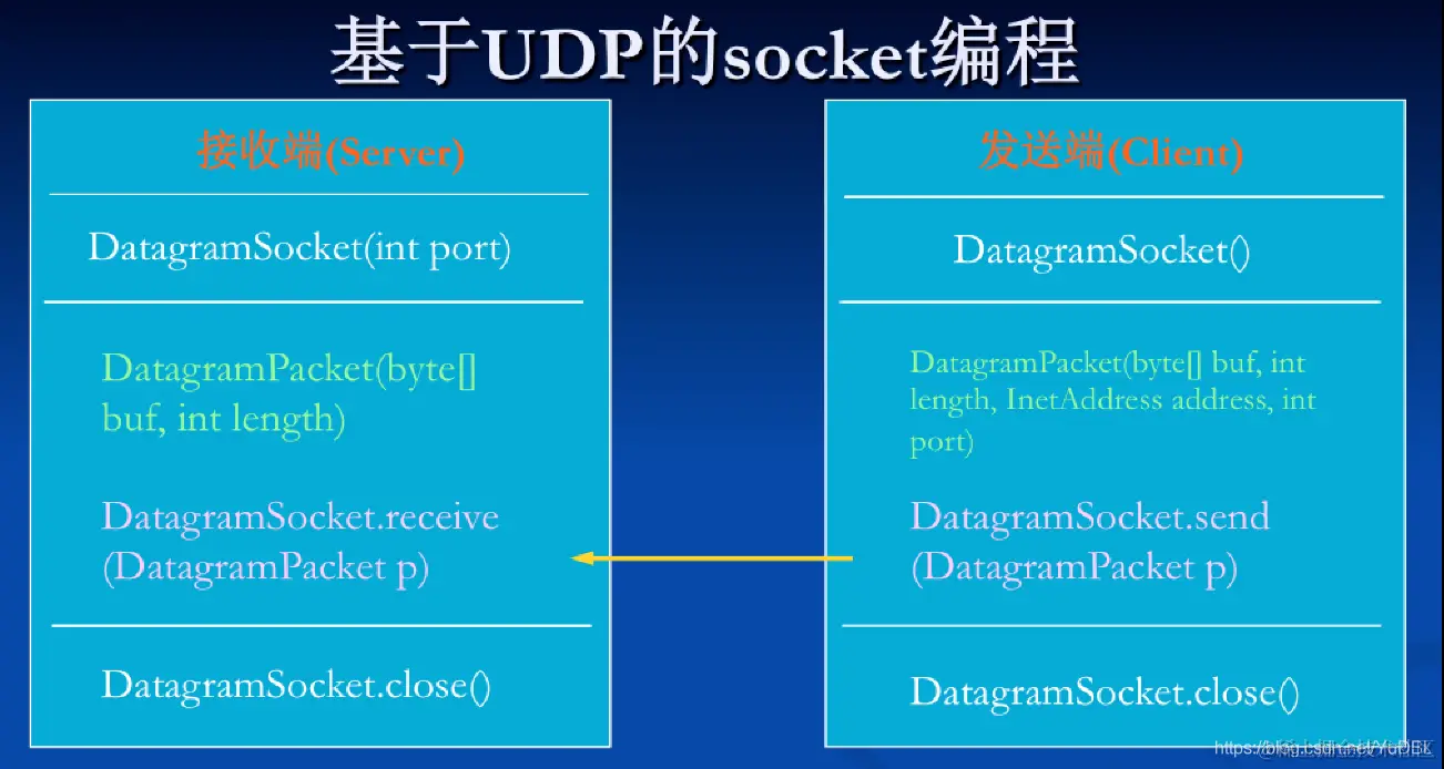 我们首先创建数据报套接字DatagramSocket,基于UDP的套接字我们可以称为数据报套接字,当你构造数据报套接字之后,我们可以利用DatagramSocket类中的这两个方法:
