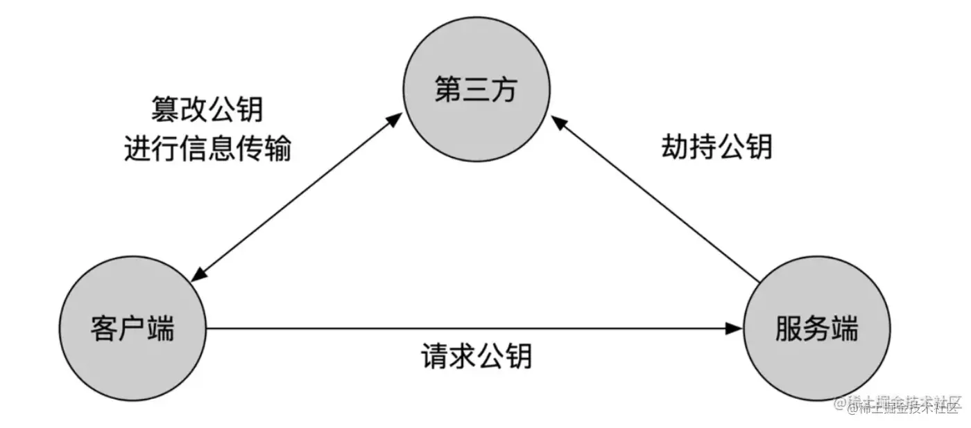 如果一开始服务端发送的公钥到客户端的过程中有可能被第三方劫持,然后第三方自己伪造一对密钥,将公钥发送给客户端,当服务器发送数据给客户端的时候,中间人将信息进行劫持,用一开始劫持的公钥进行解密后,然后使用自己的私钥将数据加密发送给客户端,而客户端收到后使用公钥解密,反过来亦是如此,整个过程中间人是透明的,但信息泄露却不得而知