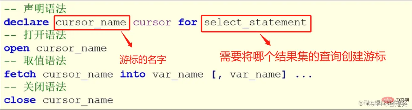 游标(cursor)是庸才存储查询结果集的数据类型,在存储过程和函数中可以使用光标对结果集进行循环的处理,光标的使用包括光标的声明、OPEN、FETCH、CLOSE