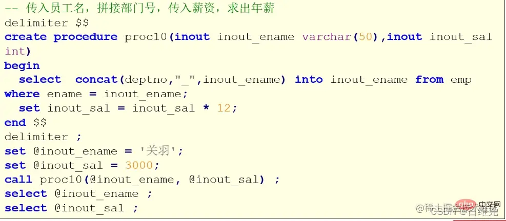 select sal into var_sal from emp where ename=in_eanme; -- 将值赋给局部变量