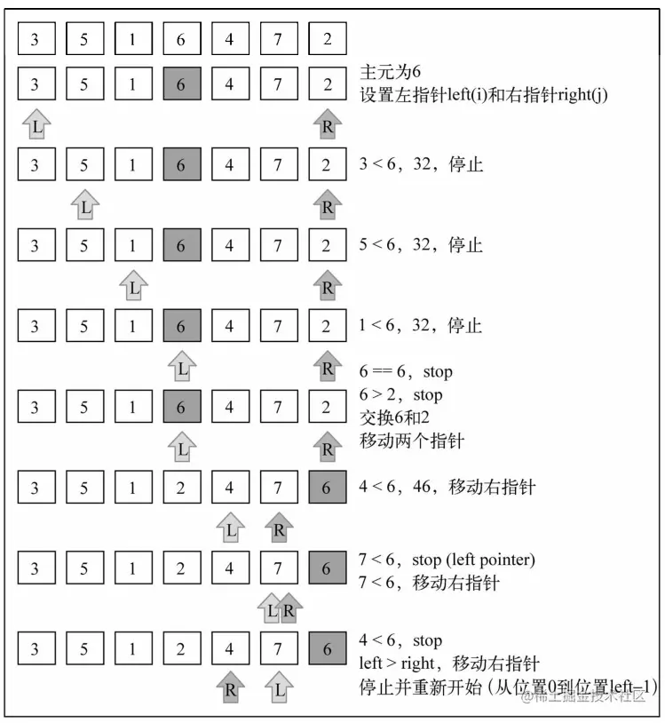 将原序列分为两部分,其中前一部分的所有记录均比后一部分的所有记录小,然后再依次对前后两部分的记录进行快速排序,递归该过程,直到序列中的所有记录均有序为止。