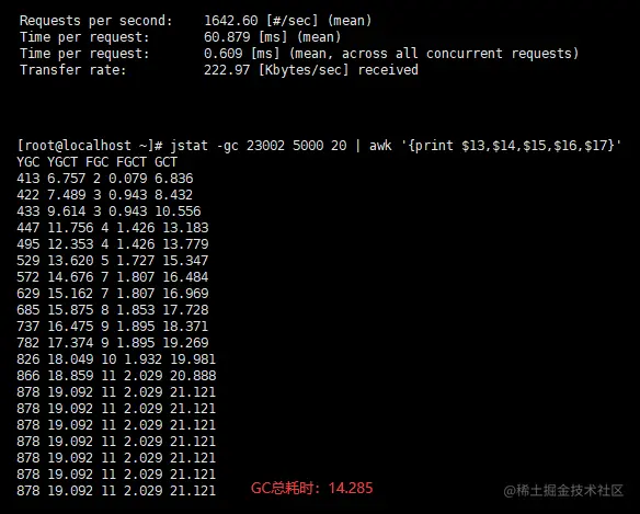 调优我们还需要监控GC,JVM 中我们使用 jstat 命令监控一下 JVM 的 GC 情况。