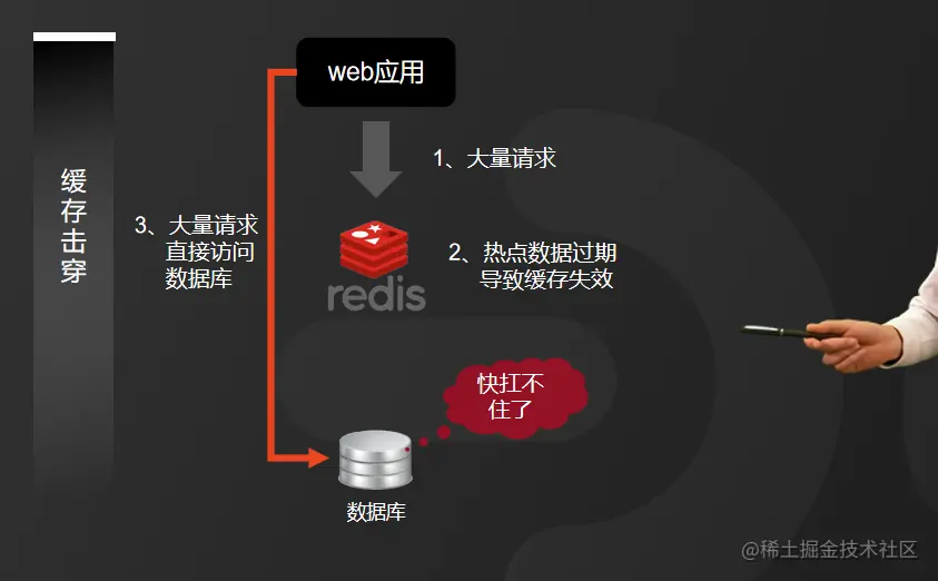 缓存雪崩:是指缓存同一时间大面积失效,后面数据查询时都查询数据库,数据查询的压力全部落到了数据库上,导致数据库短时间内承受大量的请求而down掉。如图所示: