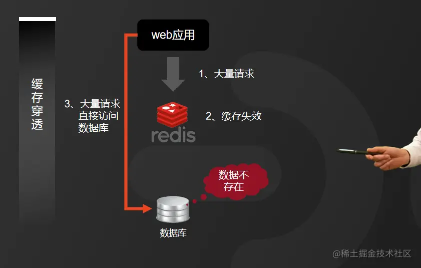 缓存穿透:是指缓存和数据库中都没有的数据,导致所有的请求全都落到数据库上,并且是并发量较高,当然也有可能是恶意攻击,造成数据库短时间内承受大量请求而挂掉。