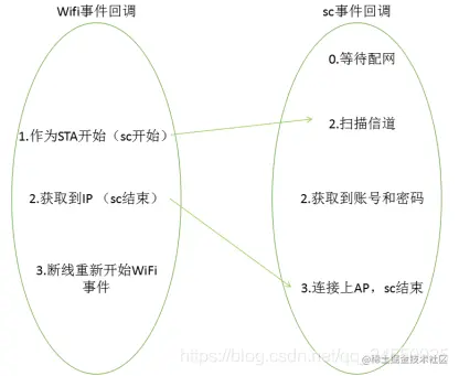 在 event_handler 中,获取到 WIFI_EVENT_STA_START 事件则开始 SmartConfig 任务 xTaskCreate(smartconfig_example_task, "smartconfig_example_task", 4096, NULL, 3, NULL);。