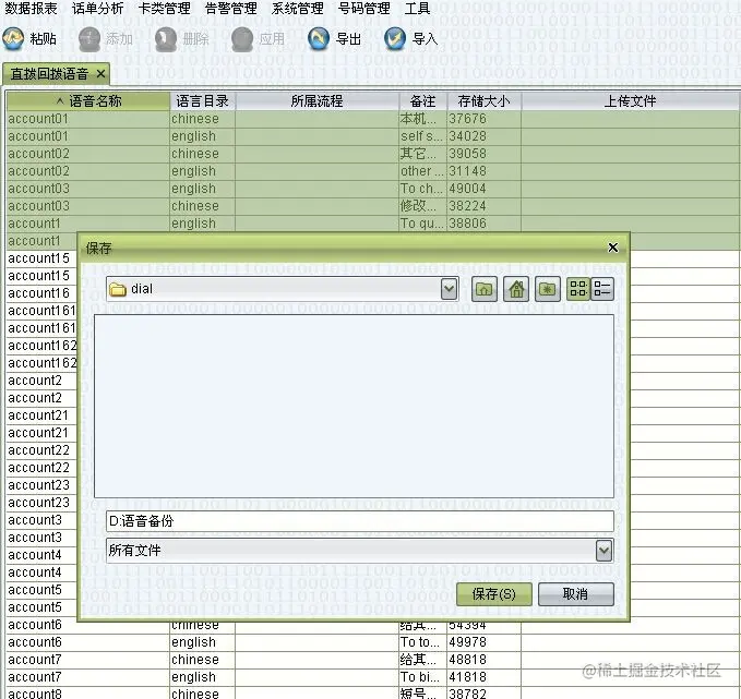 - 备份原语音文件,客户可根据自己实际需要决定是否备份原语音文件。若需备份,则首先选中全部需备份语音文件后点击导出按钮(若一个都不选则表示选择全部),选择要存放的目录,点击“保存”即可。