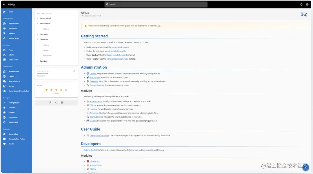 这个 14.7 K Star 的开源项目是基于 Node.js 构建的现代且强大的 wiki 应用程序。使用 Wiki.js 漂亮而直观的界面让编写文档成为一种乐趣!