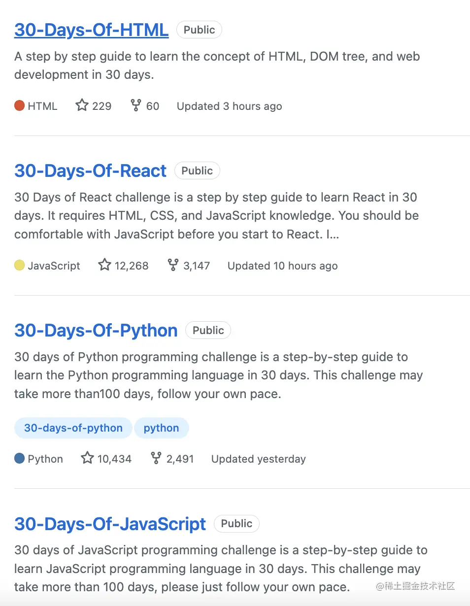 除了 30 天学会 React,开发者还发布过 30 天学会 JavaScript 等项目。