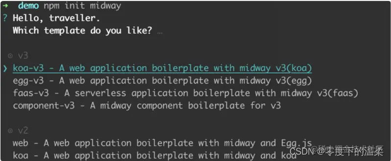 我们这里使用3.0版本,因此我们这里选择koa-v3,输入项目名称, 脚手架会帮我们创建一个简单的项目工程,等安装完成。