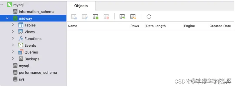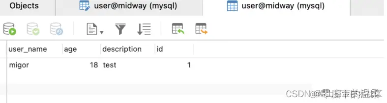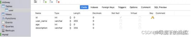 通过InjectEntityModel 装饰器,注入实例化userModel,启动服务之后,我们在midway数据表中增加user table