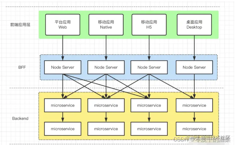 随着 Node.js 的成熟,在2015年,基于BFF(Backgroud For Frontend, 服务于前端的后端)的架构理念被提出,BFF 架构通过在UI 和服务端之间加入中间层,解决了前后端职责难以划分的问题。