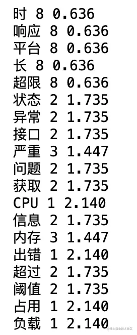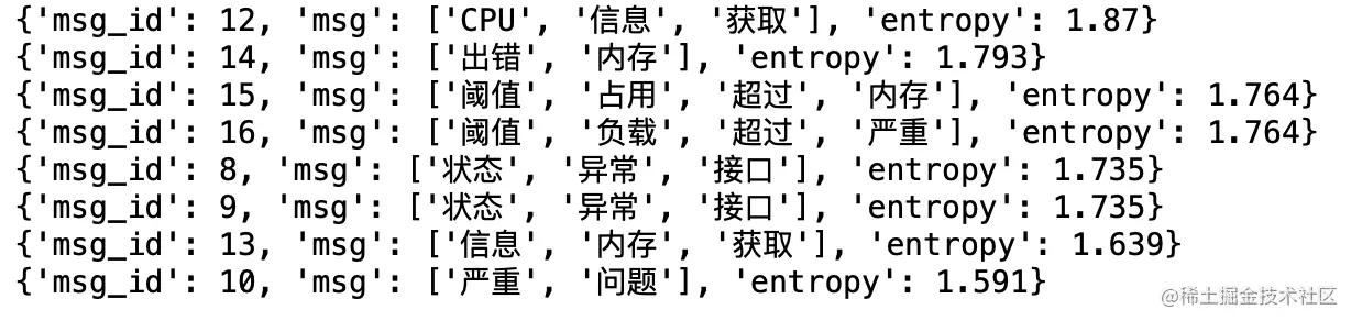 以下以自定义的一组告警消息(17条)和停用词,展开实验。停用词是指在处理自然语言数据(或文本)之前自动过滤掉某些字或词,以避免无意义的单词影响文本熵的计算结果,这些字或词即被称为Stop Words(停用词)。本实验中由于实验文本数据样本较小,所以只是针对性地引入了一些停用词。