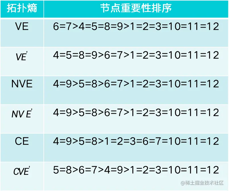 根据拓扑熵的计算方法得出的节点重要性排序如下表所示,根据经验,4、5、8、9在该网络中应重要性靠前,6、7相比于1、2、3、10、11、12应重要性较大,在这个网络结构下,NVE和NVE'的排序结果更符合实际情况。在其他网络结构下,可能需要进一步具体问题具体分析。