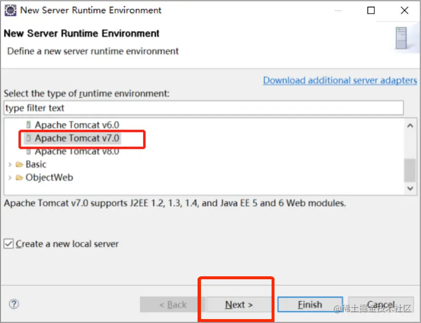 4.选择Tomcat 7.0然后Finish
