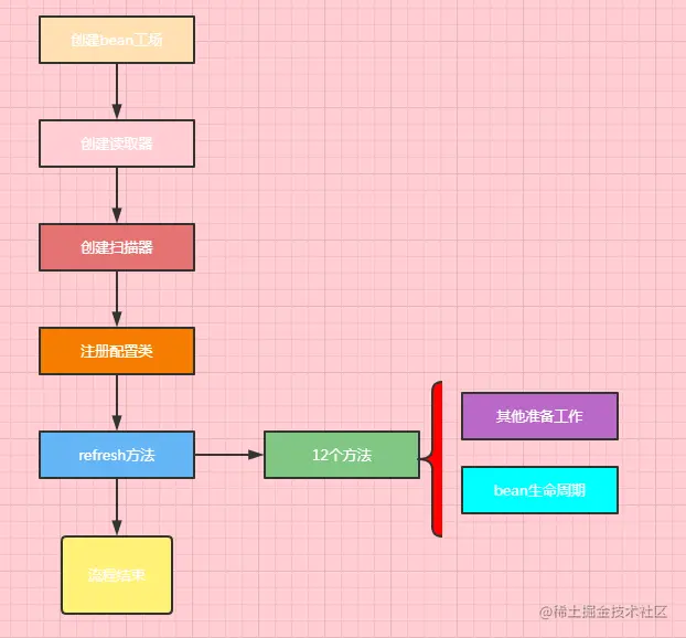 我们以现在常用的注解形式源码来探讨spring,上面的图中就是spring启动过程中的整个流程。