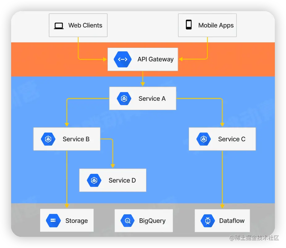 以下是系统部署简单示意图,客户端请求经过网关转发,由不同的业务服务处理,而业务服务可能依赖其他的服务,也可能依赖存储、消息队列等组件。