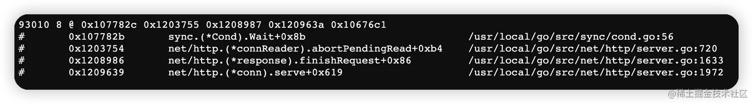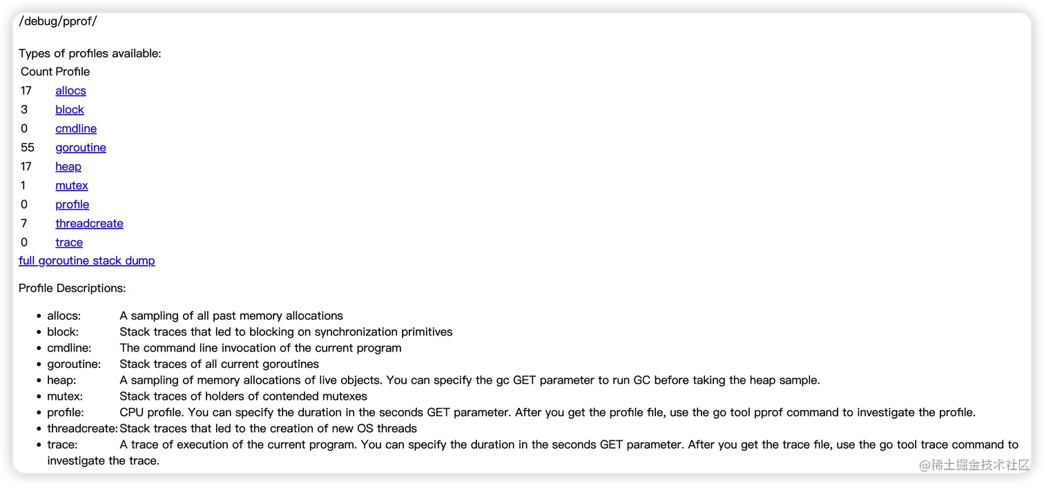 - goroutine:记录所有用户发起且在运行中的goroutine,是入口非runtime开头的goroutine,以及runtime.main所在goroutine的信息和创建这些goroutine的调用栈;