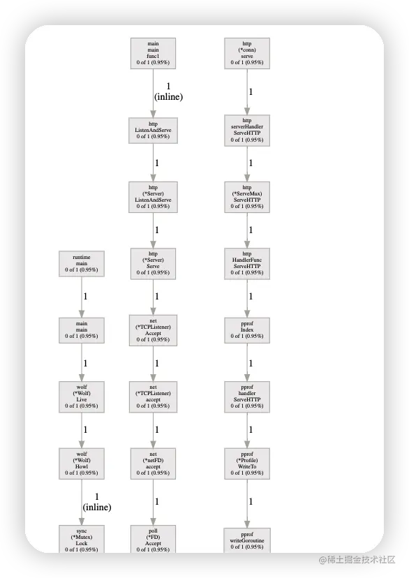 由上到下表示调用顺序,每一块代表一个函数,越长代表占用CPU的时间更长,火焰图是动态的,支持点击块进行分析,可以看见Drink函数调用创建了超过95%的goroutine。