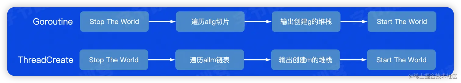 第三个是goroutine和系统线程的采样,它们在实现上非常相似,都是在STW之后,遍历所有goroutine/所有线程的列表,并输出堆栈,最后Start The World继续运行;这个采样是立刻触发的全量记录,可以通过比较两个时间点的差值来得到某一段时间段的指标。