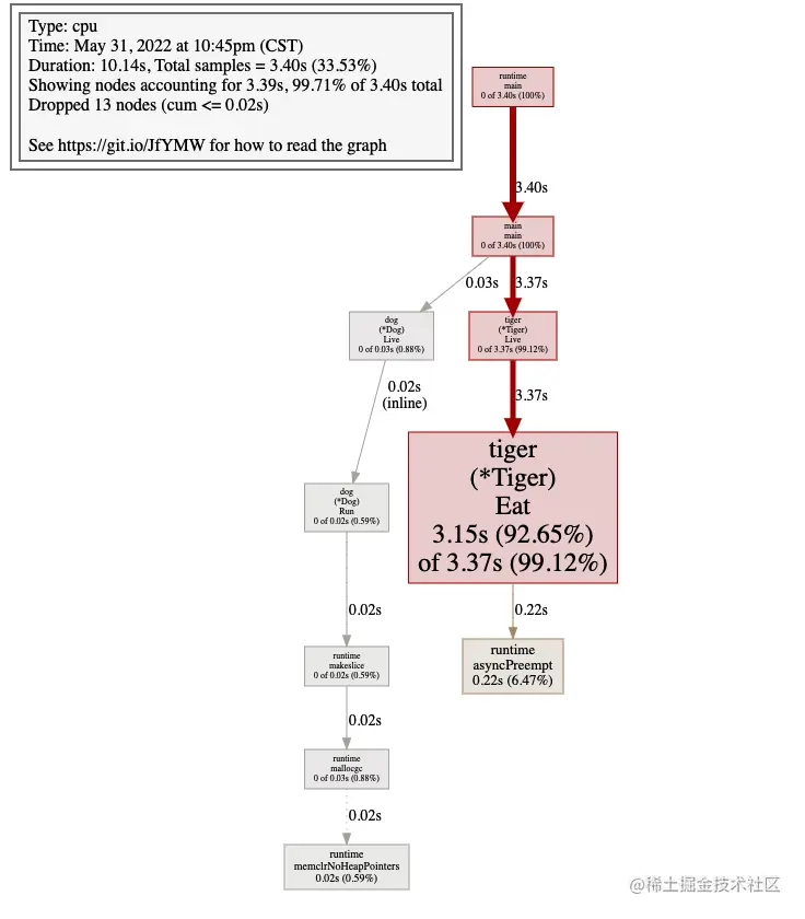 - 采样率:100次/秒,固定值; 进程每秒暂停100次,记录当前的调用栈信息,汇总后,根据调用栈在采样中出现次数推断函数的运行时间;