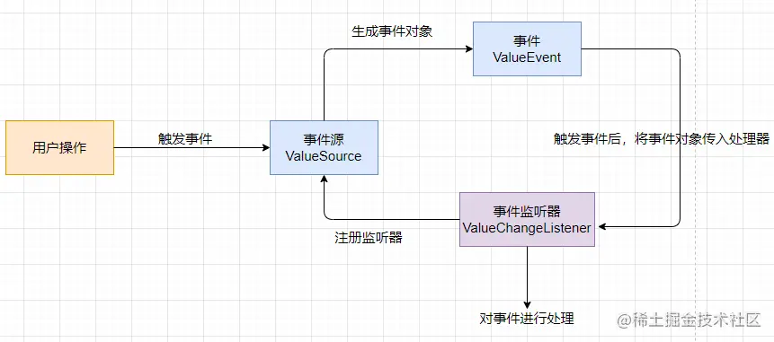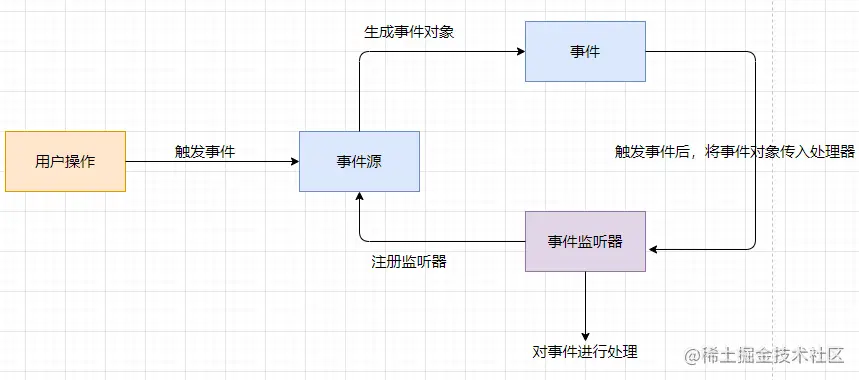 其具体流程是:用户操作(比如点击)导致事件触发,前提是事件监听器已经被注册好了,事件触发后会生成事件对象,此时事件对象会作为参数传递给事件监听器,监听器调用对应的方法进行处理。