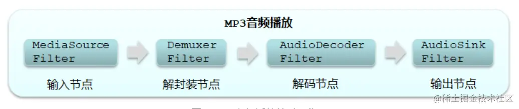 输入节点(MediaSourceFilter): 读取 MP3 原始数据,传给下一个节点。