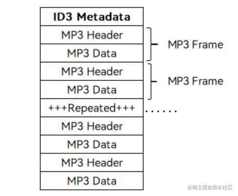 MP3 文件由 ID3 Metadata 容器头和若干 MP3 Frame(MP3 数据帧)构成。每个 MP3 Frame 又由 MP3 Header(MP3 头信息)和 MP3 Data 构成。这一系列的 MP3 Frame 称为 ES Data( Element Stream Data)。