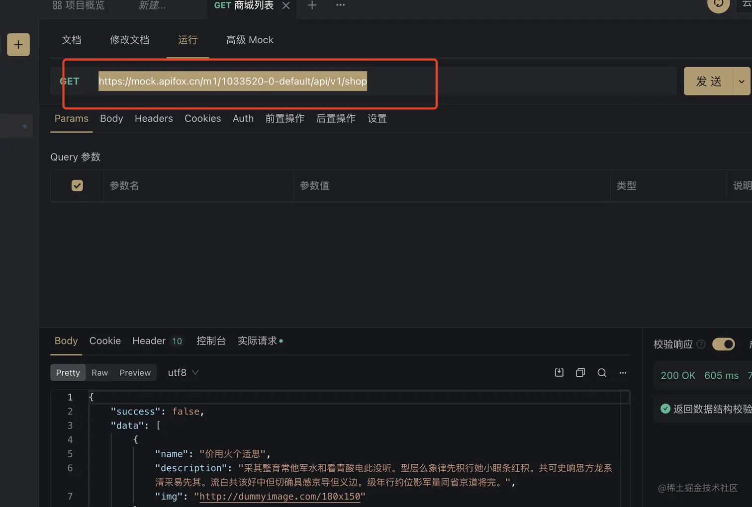 然后我们返回接口管理,选择咱们刚刚新建的那个接口,记得把右上角的运行环境切换成远端Mock哦