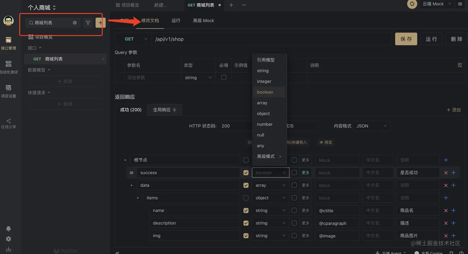往下滚动,你会发现返回响应这个分区,在这里可以定时此接口的返回数据结构,并可以在此处进行Mock规则的选择,Apifox提供了超多Mock规则供你选择!!!