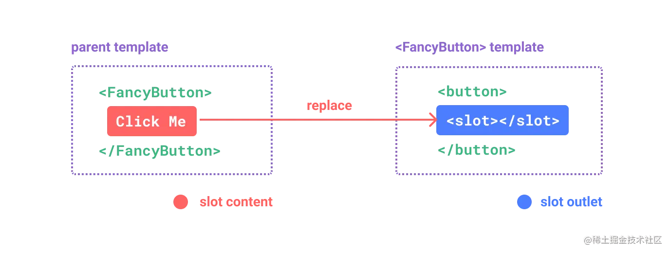 这个和web component里一样,有一个<slot>标签,这里<slot> 元素是一个插槽的插口,标示了父元素提供的插槽内容将在哪里被渲染。