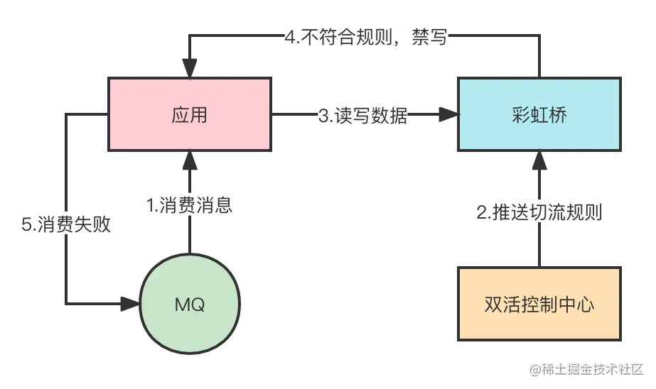 彩虹桥会用到禁写规则,当禁写规则在配置中心修改后,彩虹桥能立马感知到,然后会根据SQL中携带的shardingkey进行规则的判断,看当前shardingkey是否属于这个机房,如果不属于则进行拦截。