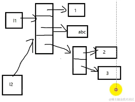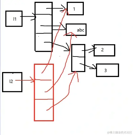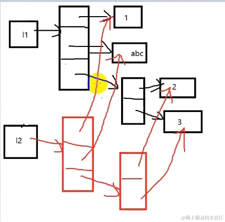 - l1和l2的前2个成员变量的内存是一样的, 因为它们直接引用的不可变数据类型;