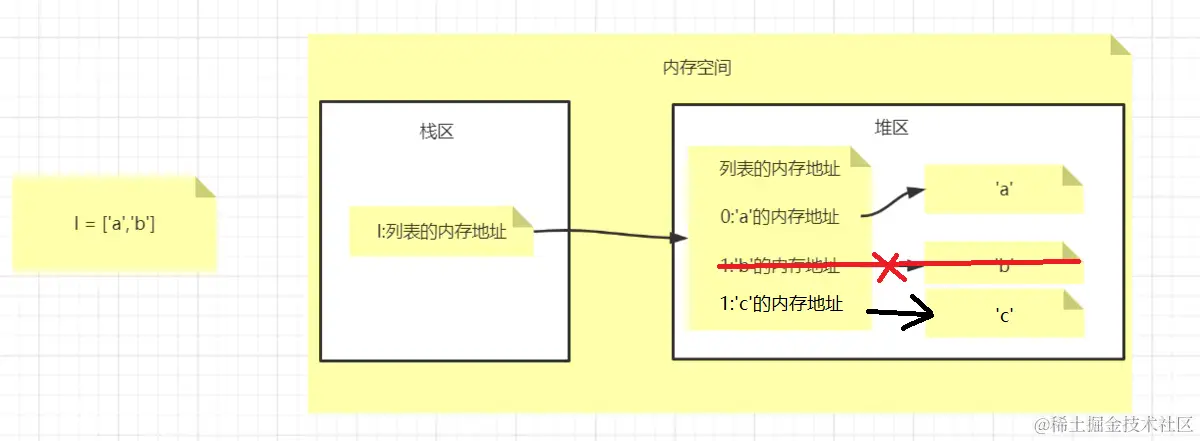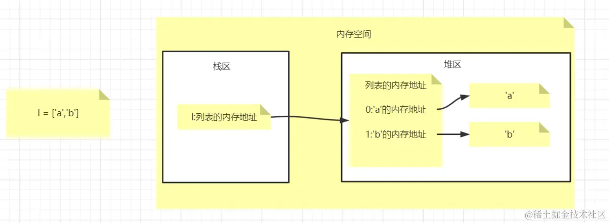 定义列表变量l,其存储结构如图:变量l存储于栈区,变量l通过存储在堆区中列表对象内存地址访问列表对象,然后列表对象再通过其列表中存储的元素地址访问具体的变量值'a' 和 'b'。