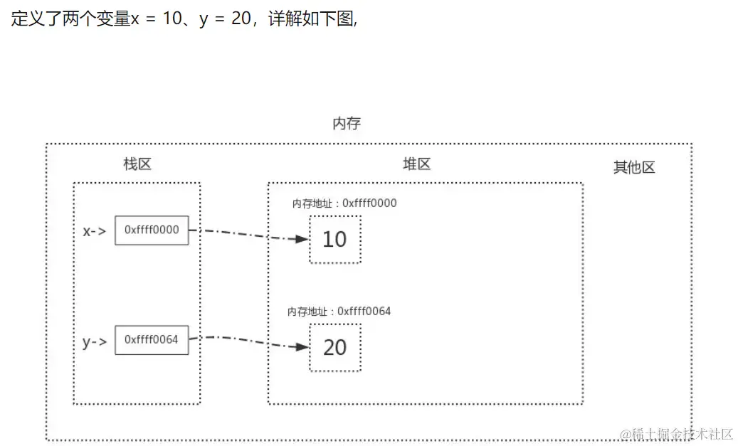 变量名(变量值的地址)存于内存栈区,变量值存于堆区, 变量名直接关联变量值。