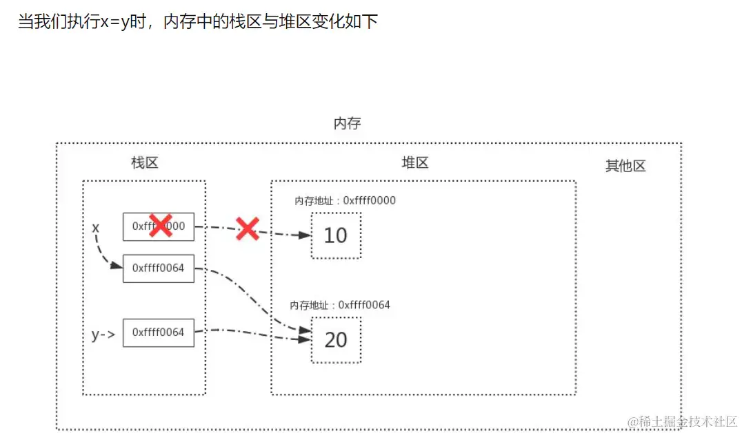 当执行x = y 时,你会发现x已经指向了一个新的对象,和原来的对象链路已经断开了。