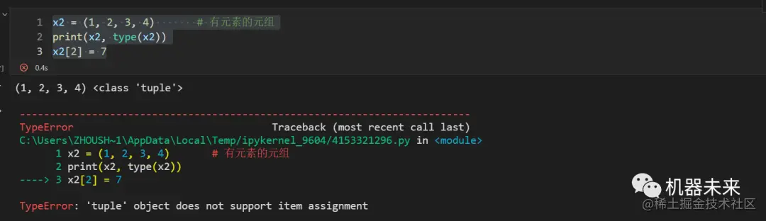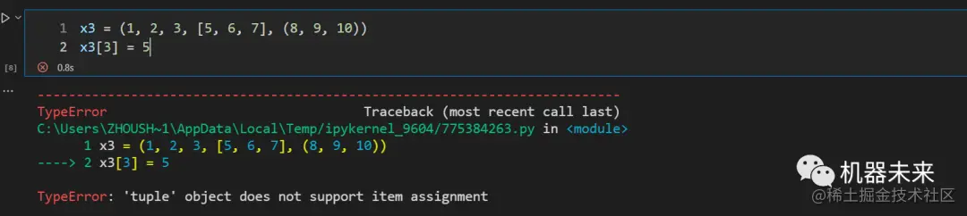 x3[3] = 5 # 修改元组中的元素x3[3], 元组是不可变数据类型,元组中的元素不可以被修改
