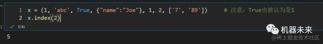 x = (1, 'abc', True, {"name":"Joe"}, 1, 2, ['7', '89']) # 2所在位置索引为5