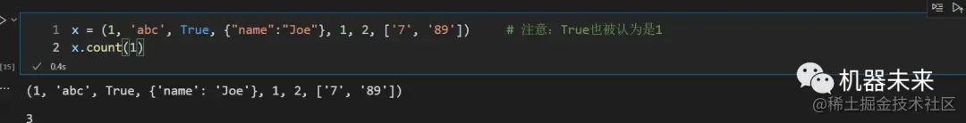 x = (1, 'abc', True, {"name":"Joe"}, 1, 2, ['7', '89']) # 注意:True也被认为是1