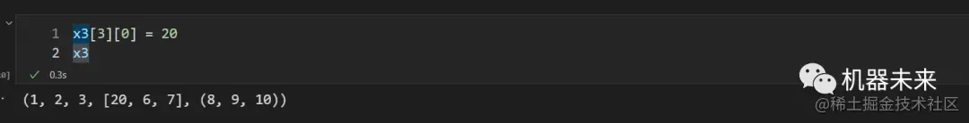 x3[3][0] = 20 # 元组中的元素是可变数据类型列表,修改列表中的元组是可行的