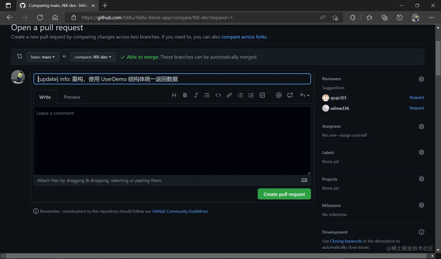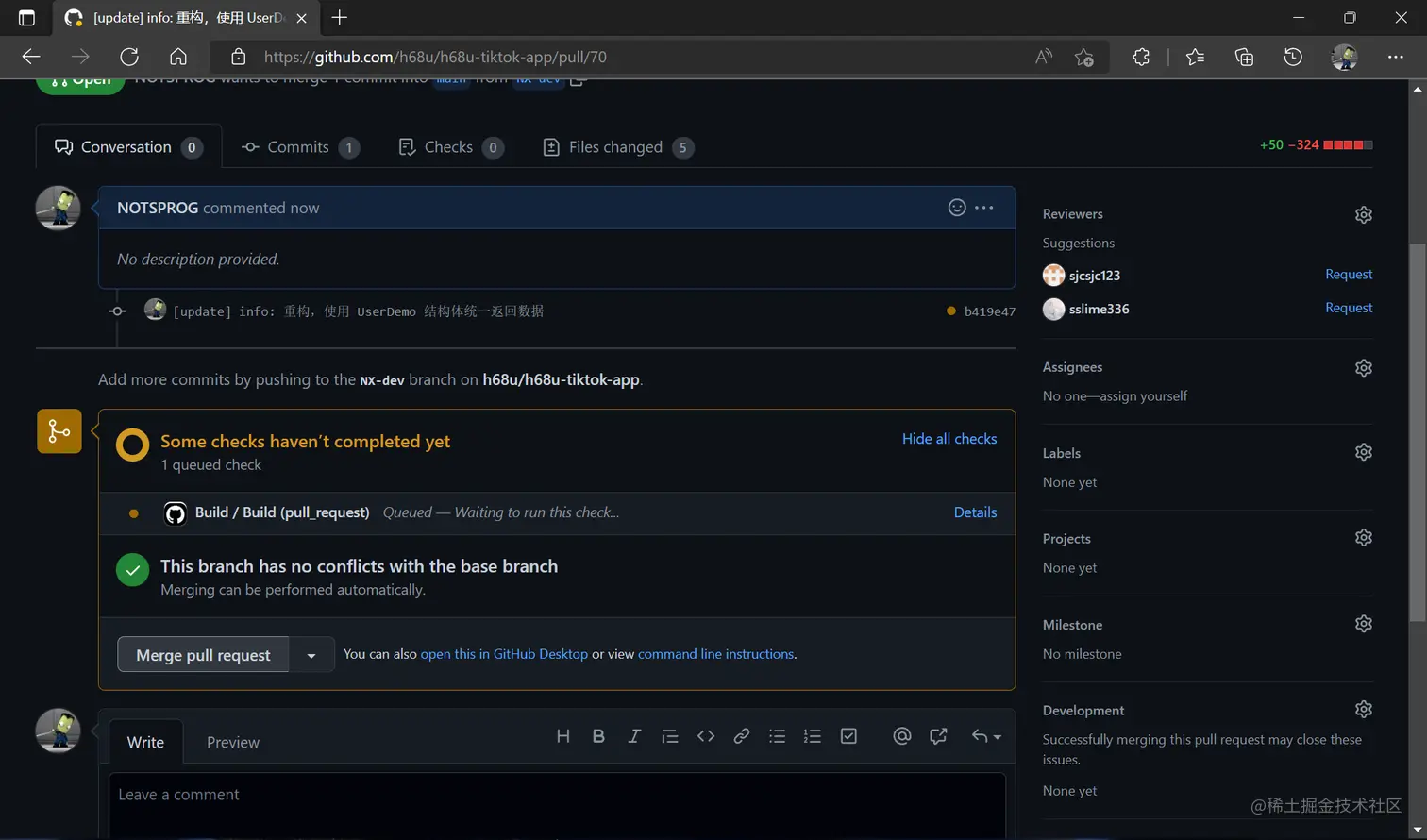 - 在 GitHub 上合并到主分支,完成对主分支的更改