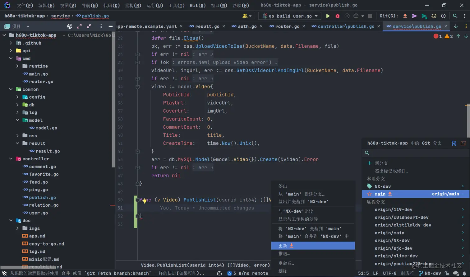 点击右下角的「Git 分支」 按钮,从主分支新建分支