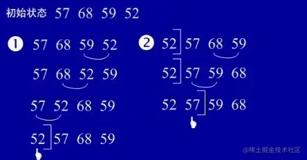 基本思想:在要排序的一组数中,对当前还未排好序的范围内的全部数,自上而下对相邻的两个数依次进行比较和调整,让较大的数往下沉,较小的往上冒。即:每当两相邻的数比较后发现它们的排序与排序要求相反时,就将它们互换。