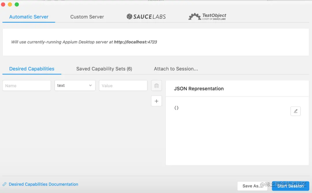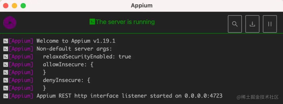 下载对应系统的 Appium 版本,安装完成之后,点击 “Start Server”,就启动了 Appium Server。