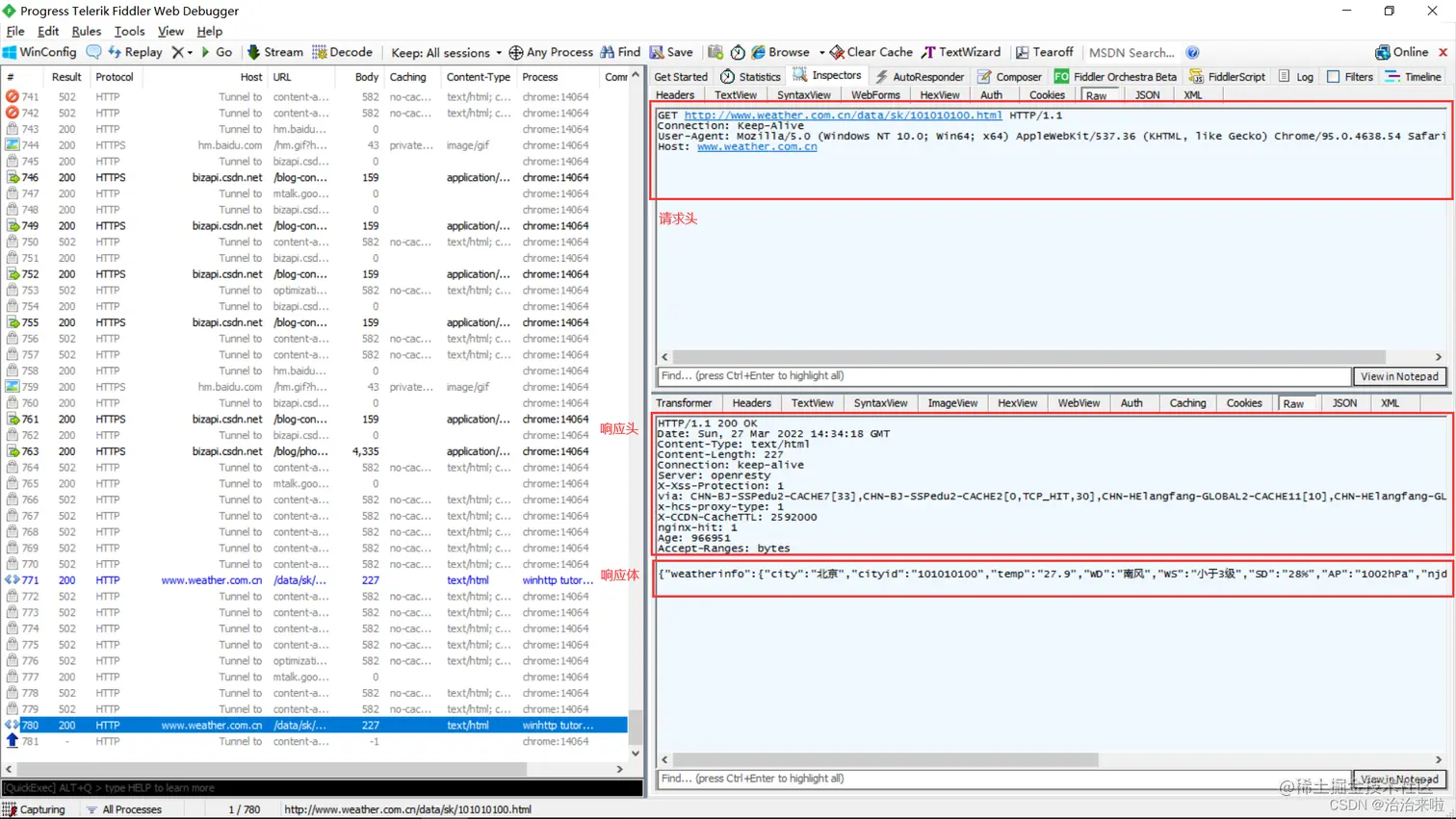 下面的空行之间的内容是消息报头,和请求头的格式一样,但是字段内容有差异,具体含义自己可以查阅资料深入了解。隔一个空行后面是服务器返回的真正内容(本例子返回的是北京城市的天气信息)。
