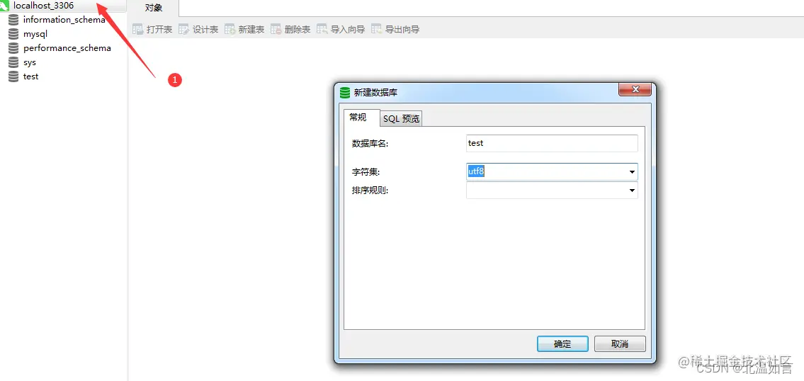 3.右击❶处,选择创建数据库,根据你的选择,起一个数据库的名字,设置数据库的字符集