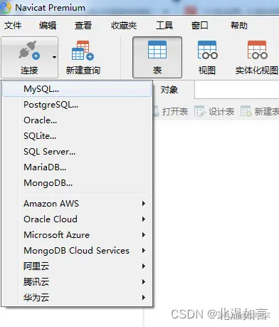 我使用的是Navicat Premium 15来对数据库进行操作 1.点击连接,选择MySQL,连接所需要的数据库