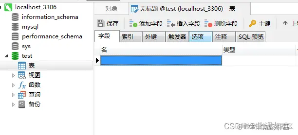 4.双击你新建的数据库,在表中新建表,设置需要的字段以及表名,保存即可