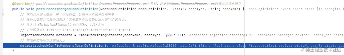进入postProcessMergedBeanDefinition()方法,显然这里的实现是AutowiredAnnotationBeanPostProcessor#postProcessMergedBeanDefinition()里。预处理方法postProcessMergedBeanDefinition()会比真正的注入方法postProcessProperties()先执行,因此调用postProcessProperties()时都是直接拿缓存。