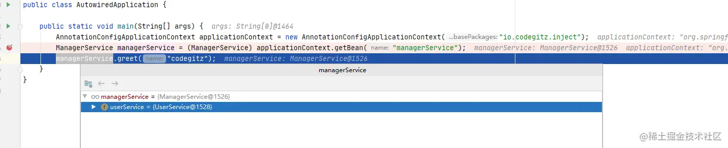 再新建个ManagerService,前面的UserService会注入到这里,然后greet()方法会调用UserService#sayHi()方法。