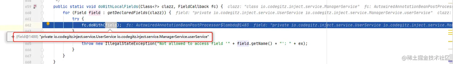 跟进ReflectionUtils#doWithLocalFields()方法,可以看到这里会获取类上所有声明的注释,然后逐个放入到FieldCallback进行处理,可以看到这里已经获取到了我们类上的userService属性,跟进fc.doWith(field)方法。